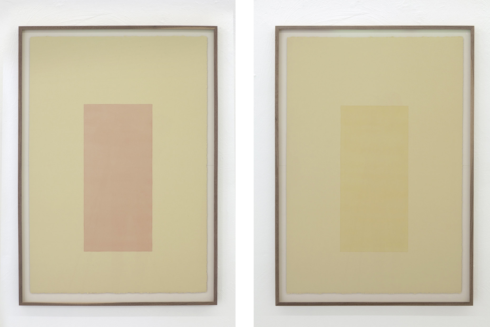 Askese (rosa og gul), blekklavering på bomullspapir, 123×86 cm, 2015. Asceticism (pink and yellow), ink on cotton paper, 123×86 cm, 2015.