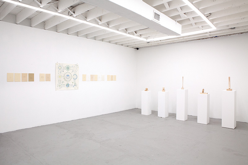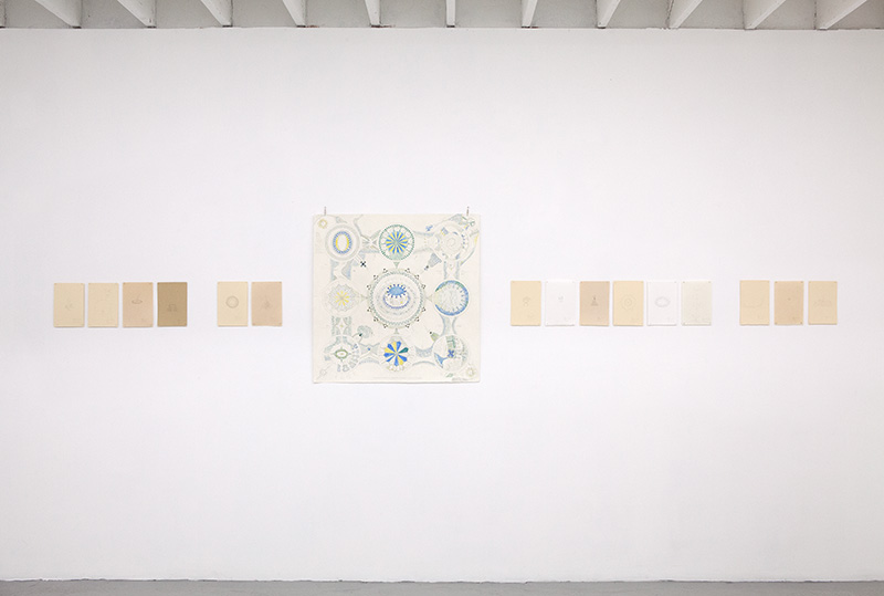 Installation view. To the left Voynich manuscript studies. Pencil, ink and gouache on paper. To the right Humming #96, #95, #97, #93, #98.