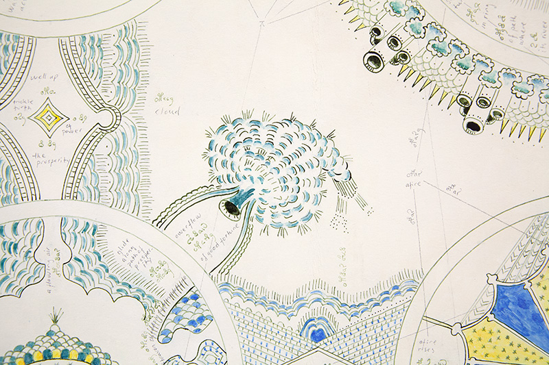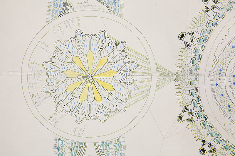 Approximately 50 of Bugge Vatne ́s drawings, inspired by her longtime research of the Voynich manuscript, will be shown for the first time in Crystal Clear Light. This fifteenth century codex is also referred to as the world’s most mysterious book, written in a language no longer known. Among her drawings are carefully selected parts of the illustrations and text from the manuscript. Included in this exhibition is the recently finished colored drawing of the so-called Rosette page. Bugge Vatne understands this as a kind of map of heaven, and some of her interpretations of the text are included in her enlarged version.