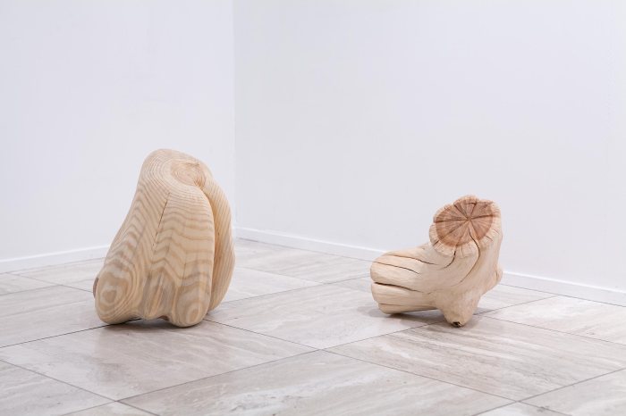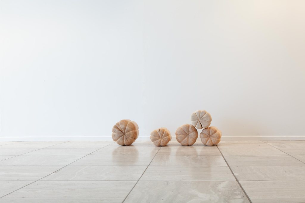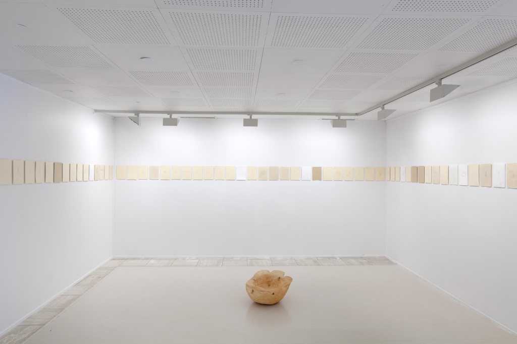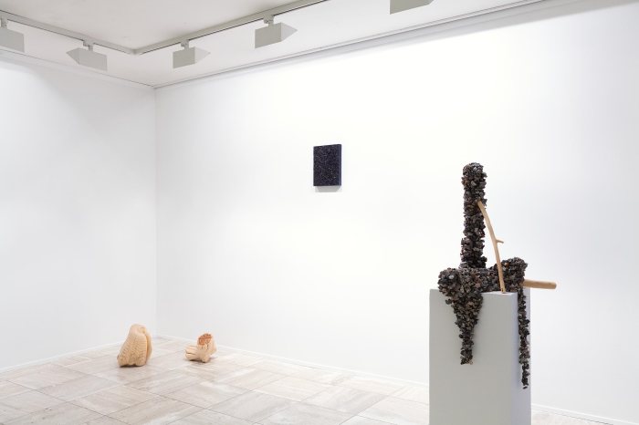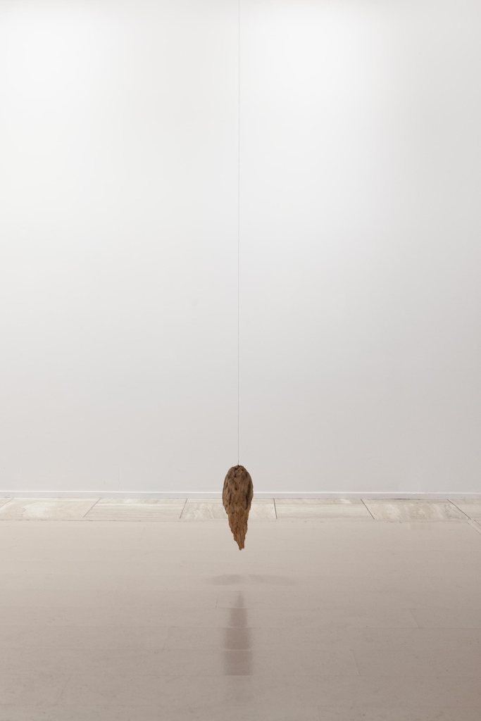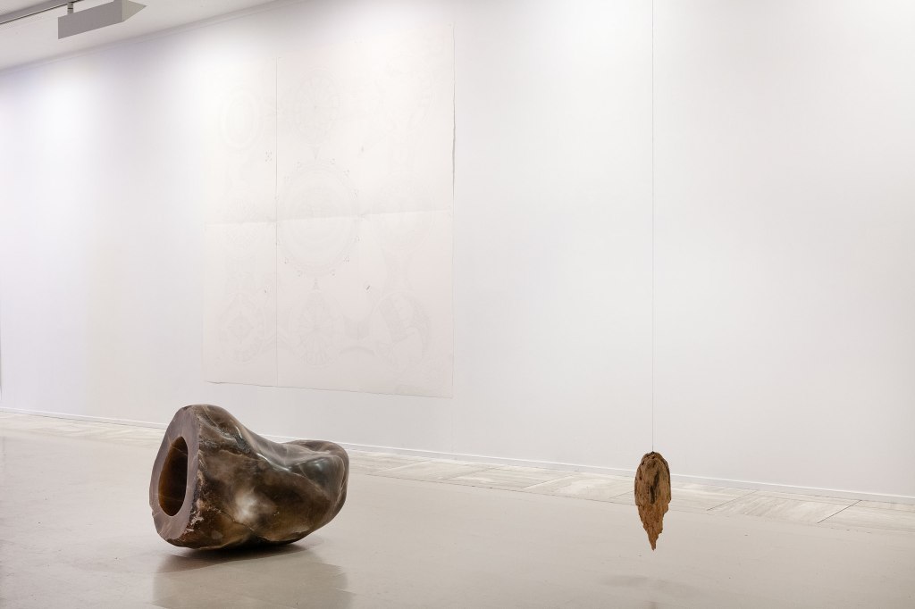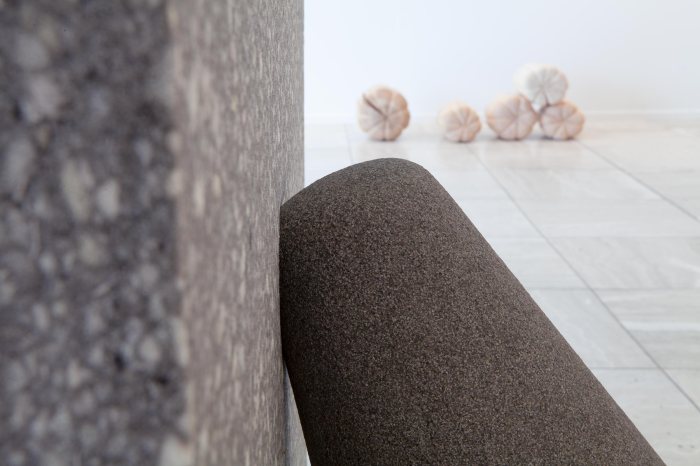 Installasjonsbilde. Humming (2018- ). Til venstre: Jord (t.v), alabast, 60x50x80 cm. Til høyre: Tapp, tre og tråd. På veggen: Kopi av Rosettekartet i Voynichmanuscriptet i størrelsesforhold 4:1.