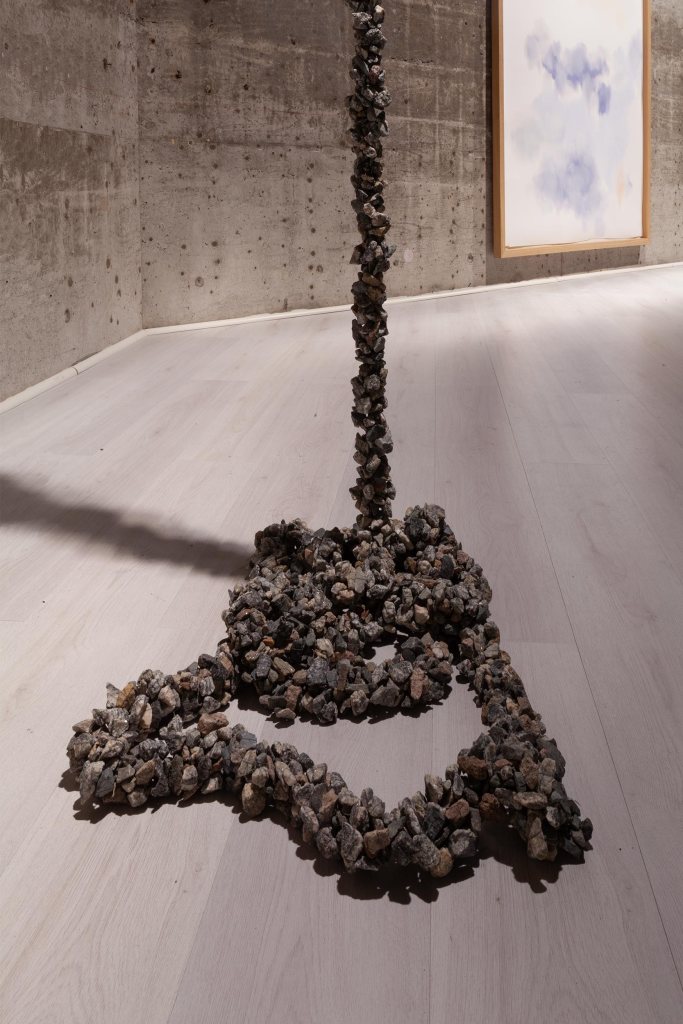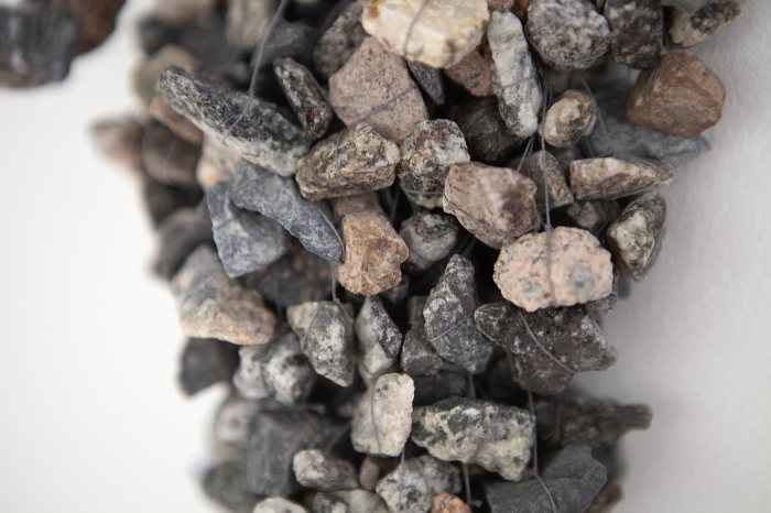 Humming (2018- ). Stein, pukk, tråd og tau, 6 m. Bildet på veggen er av Margrethe Aanestad.