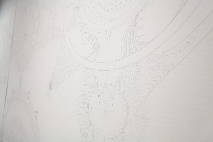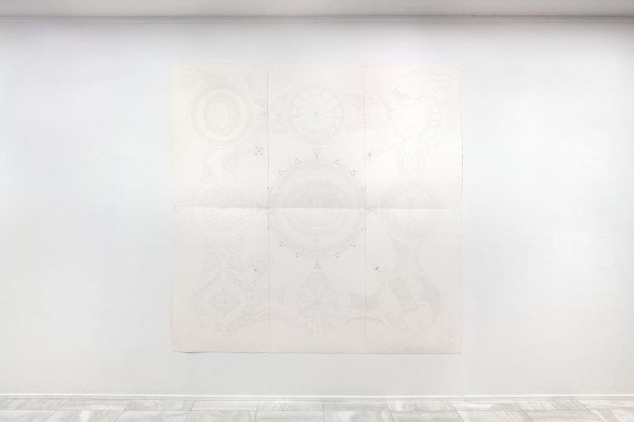 Voynich-studie. Kopi av Rosettekartet i Voynichmanuskriptet i størrelsesforhold 4:1. Blyant på papir, 180×180 cm 2024. Tegning under arbeid.