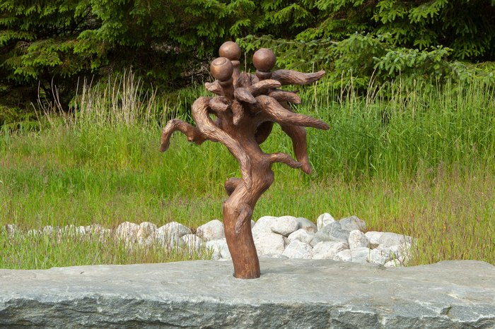 Inde i scenens midte er tre skulpturer placeret i skovbunden. De udgøres af tre mellemstore sten, hvorover et lag corian smyger sig, bølgende, som et beskyttende lag. Igen et skulpturelt møde mellem et bøjeligt stenlignende og menneskeskabt materiale, og naturstenene selv. Værket hedder Gjennom varm luft. For ligesom når hed varme får verden til at smelte for éns øjne, lige sådan smelter og bølger disse flade falske sten-lag sig over de ægte runde sten. Corianen danner et slags skjold over stenen, som var den en skrøbelig skat, der skal passes på. Et stykke herfra står værket Tynne Stammer i midten af scenariet og stritter frimodigt op fra skovbunden: en kæp besat med hundredevis af småsten, der omhyggeligt og møjsommeligt er viklet med snor om hinanden og på kæppen. Fra det døde træ hænger der lignende småsten og dingler i tynde tråde. Som smykker på de døde grene. En opadgående stritten og en nedadgående dinglen fra det døde; en skønhed i det henfaldne.