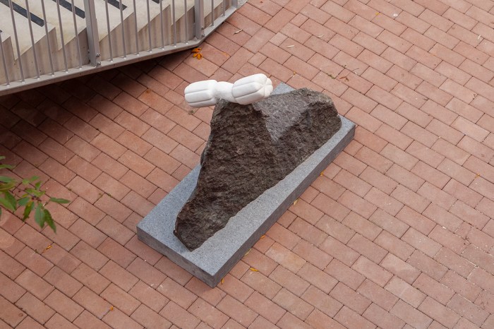 I denne bevægelse mellem noget opadgående og noget nedadgående, mellem noget uvant strunkt og noget unaturligt bøjeligt, spiller Bugge Vatne på vores oplevelse af universets kræfter, særligt tyngdekraften, som i hendes skulpturer sættes i spil som et drama i sig selv. Det ses i nitobernes måde at stå ret og lige, for så pludselig at bøje sig, men uden at falde. Og det ses i flere tidligere værker, som helt ind i titlen fremhæver dette fokus: for eksempel i Gravitasjon #2 (2011) (som var med på udstillingen En Endeløs Søken Etter Substans (2011)), hvor en række sten balancerer oven på hinanden i en høj smal skulptur. Eller som i det helt aktuelle projekt i, udsmykningsprojektet Å flytte et punktum i Stavanger, hvor en kæmpestor rullesten fra kystlandskabet Jæren kommer til at balancere for enden af et stramt skåret stenhegn. Den massive masse fra den store natursten kommer i skulpturel karambolage med den skårede sten – som en stadig søgen efter stabilitet i det usikre terræn. Stenenes møde bliver et symbol på den stabilitet, der trods synlig skrøbelighed, trods alt findes i stormens midte, i vulkanens øje.